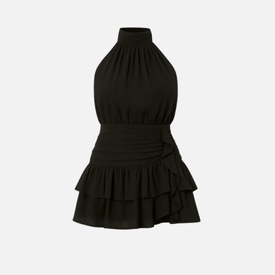 A chic halterneck mini dress featuring a fitted waist and layered ruffle skirt. Designed in a rich wine-red shade with a soft, elegant sheen. Feminine, flattering, and perfect for any special occasion.